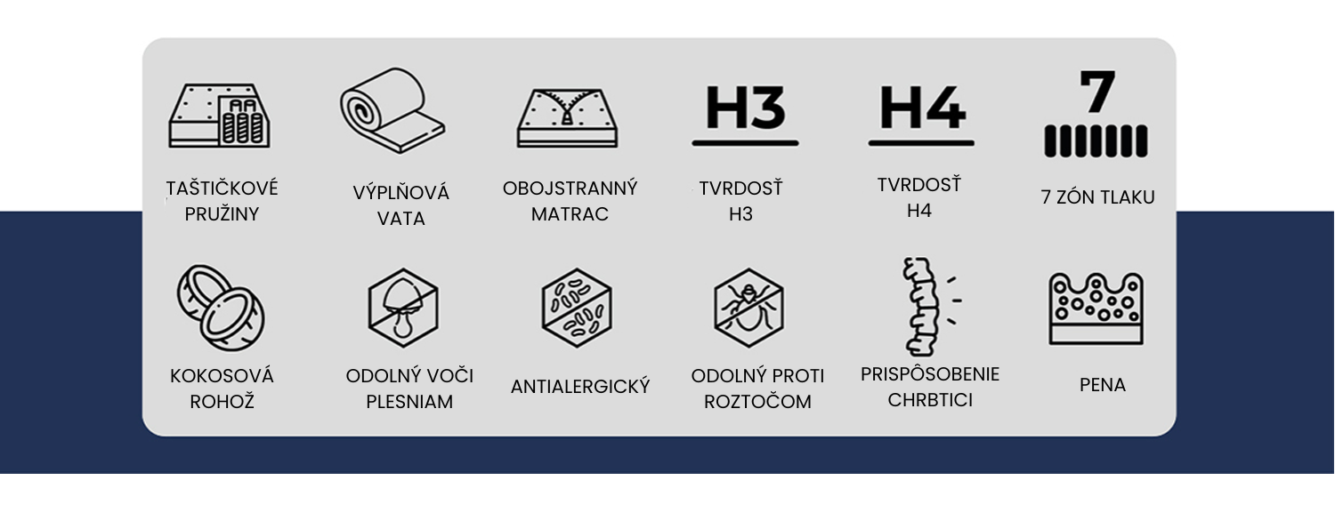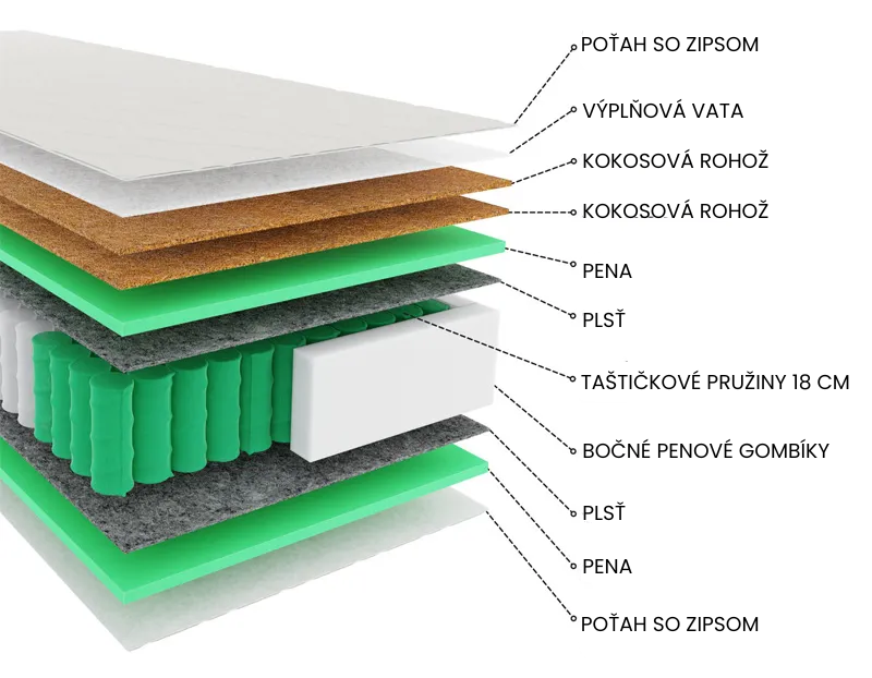 Pri navrhovaní modelu ELITE sa kládol dôraz na to, aby sa matrac prispôsobil tvaru tela. Vrstvy dynamicky reagujú na tlak v špecifických oblastiach, čím pomáhajú rovnomerne rozložiť telesnú hmotnosť a znížiť bodovú deformáciu. 18 cm vysoké pružiny, pružná pena a 2 vrstvy prírodného kokosového vlákna sú ideálnou voľbou pre ľudí, ktorí hľadajú odolný a zároveň pohodlný matrac, ktorý poskytne celému telu správnu oporu počas spánku. Matrac Harmony má výšku 24 cm a je modelom z našej novej rady moderných a pohodlných matracov. Poťah je vybavený zipsom, ktorý zaisťuje správne vetranie matraca a pomáha udržiavať príjemnú teplotu počas spánku. Vďaka zipsu sa dá v prípade potreby ľahko odstrániť a obnoviť. Vata je vrstva, ktorá pomáha pri tepelnej izolácii matraca. V zime poskytuje dostatočné teplo a v lete chráni pred prehriatím. Kokosová rohož je prírodný materiál, ktorý dodáva matraci pevnosť a poskytuje oporu chrbtici a zároveň chráni ostatné vrstvy pred nadmerným opotrebovaním. Pena je pružná a zodpovedná za správne vetranie matraca. Jej vysoká hustota zaisťuje odolnosť voči deformácii. Plsť slúži ako vrstva, ktorá oddeľuje pružiny od peny a zabraňuje deformácii. Zároveň spevňuje štruktúru matraca a pôsobí ako tlmič nárazov. Taštičkové pružiny hrajú kľúčovú úlohu v konštrukcii matraca. Každá pružina je umiestnená v samostatnom vrecku, čo im umožňuje fungovať nezávisle. Vďaka tomu sa matrac dokonale prispôsobí tvaru tela a poskytne oporu tam, kde je najviac potrebná.